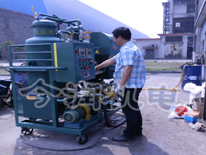 當(dāng)油液使用后達(dá)到換油周期時,固定真空凈油機(jī)到潤滑系統(tǒng)油箱旁,凈油機(jī)的進(jìn)油管路連接到設(shè)備油箱的出油口,凈油機(jī)的出油口連接到干凈的空油桶。通過脫色凈油機(jī)的二元一次脫水技術(shù)分離廢油中的乳化液、水分;絮凝吸附分離技術(shù)分離廢油中的重氧化的油泥、瀝青質(zhì)、殘?zhí)?、膠質(zhì)、染色質(zhì)等;最后通過冷卻系統(tǒng)收集分離出的乳化液和水分,通過特殊的集污系統(tǒng)收集廢油中分離出的雜質(zhì)。此時可看見清澈透明的油品流出加注到干凈油桶備用,此油品顏色恢復(fù),理化指標(biāo)達(dá)到國家油品標(biāo)準(zhǔn)。如油液用量較少,可先用脫色機(jī)把油箱內(nèi)的油液抽出注入到空油桶,并按種類、按牌號分別收集,最后再統(tǒng)一凈化。